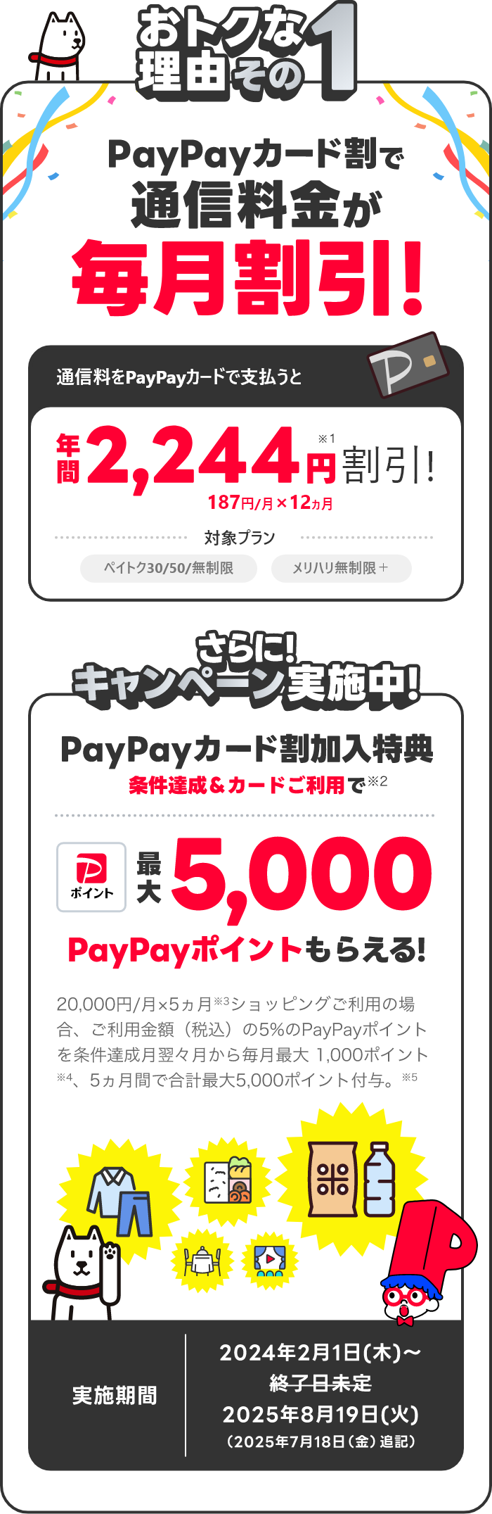 「電話番号・メールアドレスお預かりサービス」に加入した場合(ソフトバンクのみ)、譲渡・承継された場合等は、前請求月で割引は終了します。また、解約された場合、解約日の属する請求月の請求締日が2024年12月10日以前である時は前請求月に、解約日の属する請求月の請求締日が2024年12月20日以降である時は当該請求月の適用をもって割引は終了します。 - ※2【PayPayカード割加入特典の適用条件】