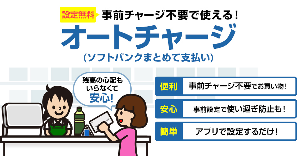 事前チャージ不要で使える! オートチャージ(ソフトバンクまとめて支払い) 設定無料 残高の心配もいらなくて安心! 便利:事前チャージ不要でお買い物! 安心:事前設定で使い過ぎ防止も! 簡単:アプリで設定するだけ!