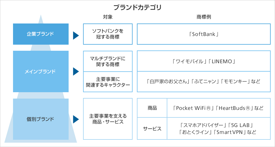 昨今ますます多様化するお客さまのご要望にお応えするため、「ソフトバンク」「ワイモバイル」「LINEMO」など、特長の異なる複数のブランドを提供しています。それぞれのブランドイメージやターゲット層に合ったキャラクター・料金プラン・サービスなどの展開と併せて、戦略的に商標権を取得しています。