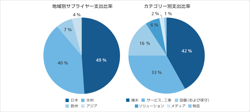 当社のサプライチェーンは世界のさまざまな国や地域に広がっています。2024年度の地域別サプライヤー支出比率は、日本53%、米州38%、アジア5%、欧州4%となっています。また、カテゴリー別のサプライヤー支出比率は、端末37%、サービス・工事37%、設備(および保守)18%、その他が8%です。