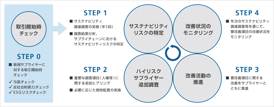 また2024年度より第三者評価プラットフォームのEcoVadis※を導⼊し、他社との⽐較など優れた取り組みを参照できる環境を整えています。リスクアセスメントの結果、サステナビリティ課題を含む不備事項や課題が発⾒されたサプライヤーを特定し、改善を促すため是正措置計画の作成を依頼しています。監査等により、最低限のESG要件を満たさないサプライヤーに対しては是正勧告をし、継続的な改善を促すとともに、重⼤な不適合事項に関しては、90⽇以内に是正に向けた改善策の提⽰が確認されなかった場合、事業活動を考慮し、総合的に判断した結果、取引停⽌となることがあります。
