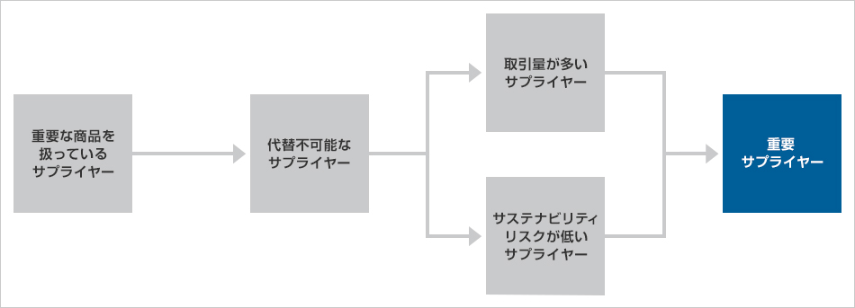 当社のサプライヤーは世界に2,000社以上存在しますが、サプライチェーンマネジメントにおいては、取引量や代替可能性の観点に加え、環境・社会・ガバナンスのESGの側面を考慮し、前年度の購入金額の上位80%以上を目安に重要サプライヤーを定め、広範にわたるサプライヤーの中における重要サプライヤーとして、適切なサプライチェーンマネジメントを行っています。