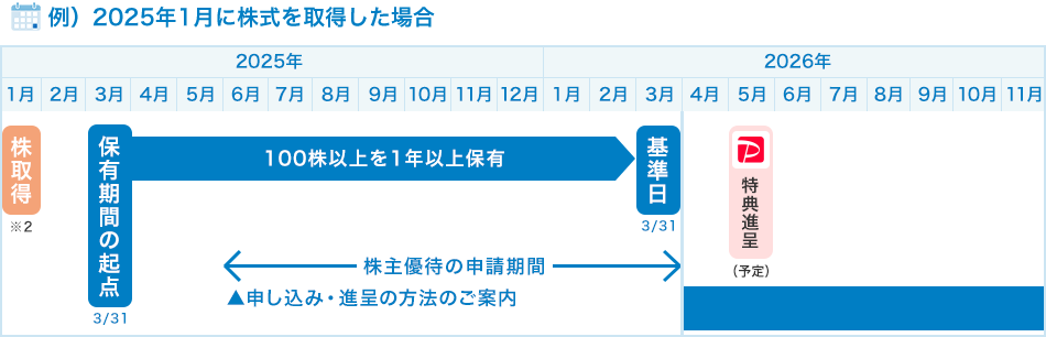対象となる株式の保有期間によって2つのパターンがあり、進呈時期が異なります。 | 不定期でのご案内となり、提供開始が決まり次第、本ページなどでお知らせします。 |