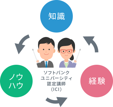 コース全体の約8割はソフトバンクの社員が講師を担当しており、業務で得たノウハウ(知恵・知識・経験)をシェアします。