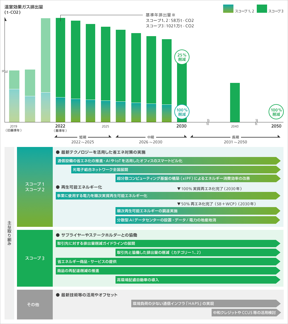 スコープ1、2の目標として、2030年までに事業活動で使用する電力などによる温室効果ガスの排出量を実質ゼロにするカーボンニュートラル目標を設定しました。2024年度までに基地局電力の92.6%の再生可能エネルギー化を完了し、さらに、基地局以外の全ての自社の施設・設備での使用電力についても温室効果ガス削減を推進します。