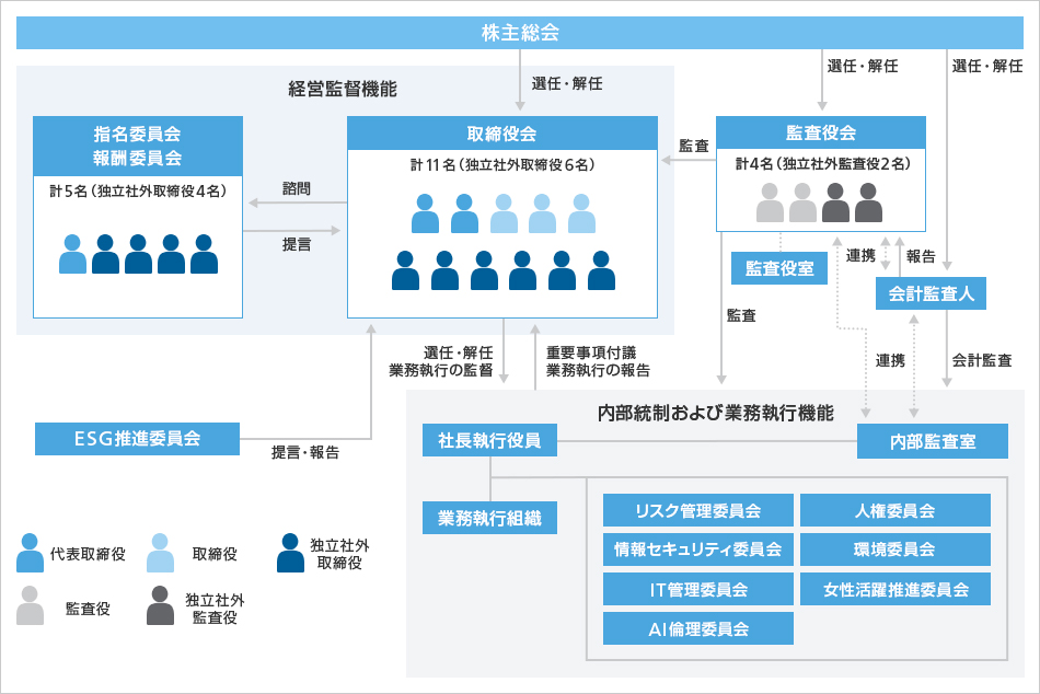 また、取り組みの社内推進、業務遂行する機関として、ESG推進担当役員のもと環境委員会を設置しています。環境委員会はCSR本部長を委員長とし当社各事業部および主要な当社グループの環境担当者で構成し、カーボンニュートラル2030達成に向けた具体的な施策を推進します。同委員会で審議・検討された事項のうち、重要なものについてはESG推進委員会へ報告します。