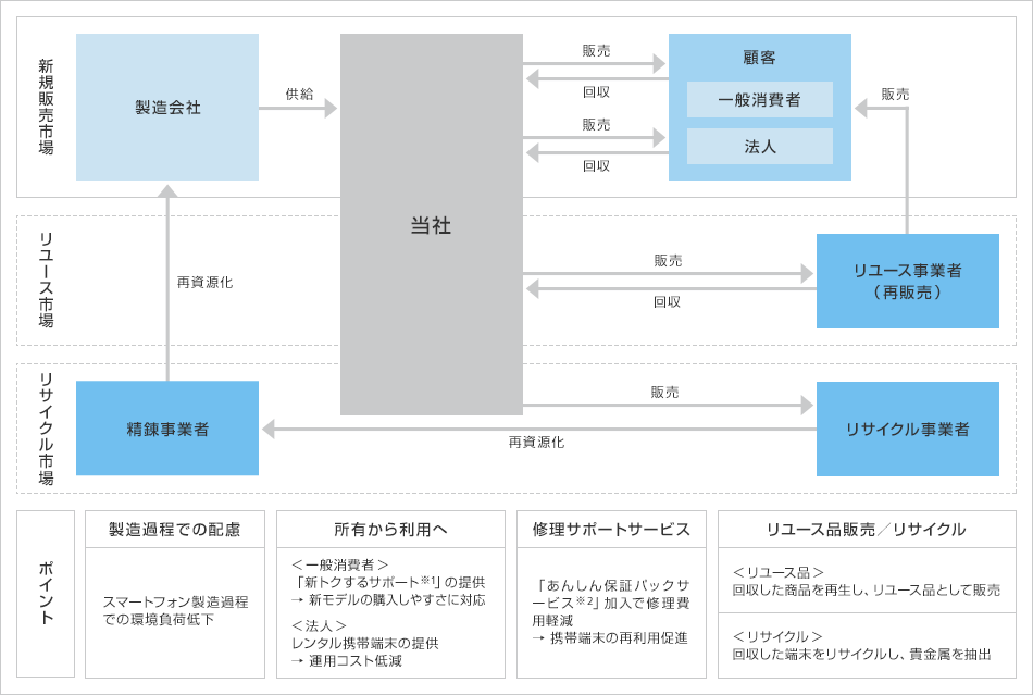 当社はお客さまに販売・レンタルした携帯電話端末を効果的に回収・再販売しています。近年国内外の中古スマートフォン市場が成長している中、今後も顧客ニーズの細分化に合わせた付加サービスを拡充し、市場ニーズに対応していきます。