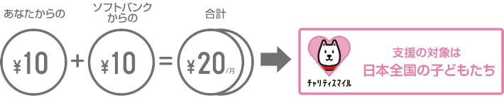 「チャリティスマイル」は、自然環境の維持や再生など、気候変動対策や持続可能なまちづくりのための日本各地の環境保全活動への継続的な支援を目的とした携帯電話のオプションサービスです。毎月お客さまから10円の寄付※1をいただき、ソフトバンク株式会社(以下「ソフトバンク」)も同額を拠出することで、一人当たり毎月合計20円を、環境保全活動に取り組む自治体や団体に届けます※2。