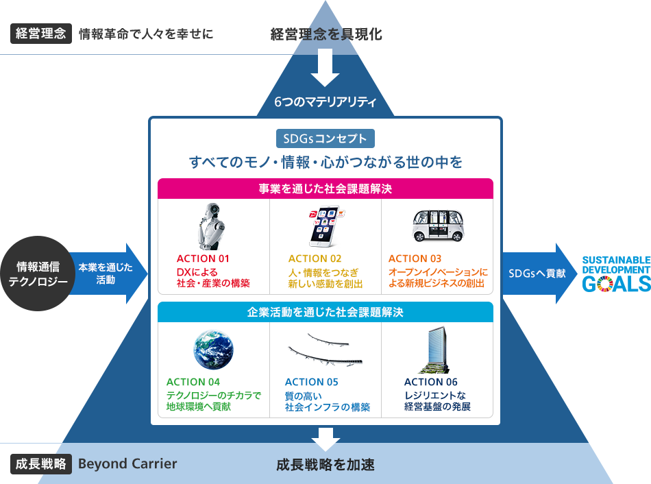 持続可能な社会への貢献と持続的な成長の両立を目指すコンセプト「すべてのモノ・情報・心がつながる世の中を」をテーマとして、6つの「マテリアリティ(重要課題)」を特定しました。この6つのマテリアリティは、経営理念の「情報革命で人々を幸せに」を具現化するとともに、成長戦略「Beyond Carrier」とをつなぐ重要な羅針盤であると考えています。当社は、マテリアリティの特定と対応を通じて経営戦略を加速させ持続可能な社会の実現に貢献します。