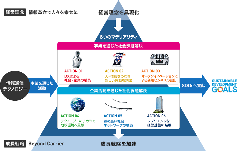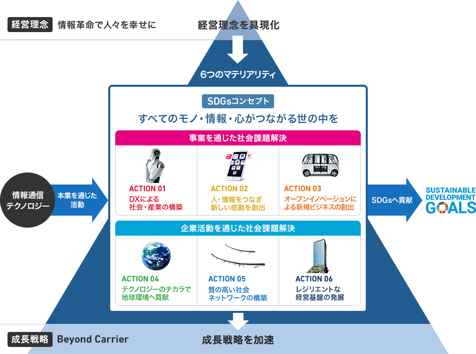 持続可能な社会への貢献と持続的な成長の両立を目指すコンセプト「すべてのモノ・情報・心がつながる世の中を」をテーマとして、6つの「マテリアリティ(重要課題)」を特定しました。この6つのマテリアリティは、経営理念の「情報革命で人々を幸せに」を具現化するとともに、成長戦略「Beyond Carrier」とをつなぐ重要な羅針盤であると考えています。当社は、マテリアリティの特定と対応を通じて経営戦略を加速させ持続可能な社会の実現に貢献します。