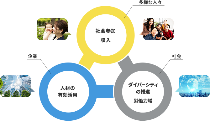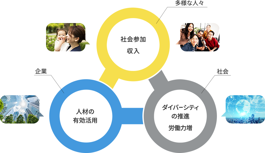 「ショートタイムワーク」は、障がいや子育て、難病や慢性疾患などの理由で長時間の勤務が難しい方が、週20時間未満の短時間から特定の職務を担当することで、就労環境を整え、企業や地域と「共に働く」を実現できるインクルーシブな働き方です。それぞれの特性や経験を生かして働く機会を創出することで、多様な人々が社会に参加する第一歩につながります。また、企業や地域にとっても人材の有効活用が期待できます。