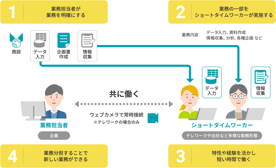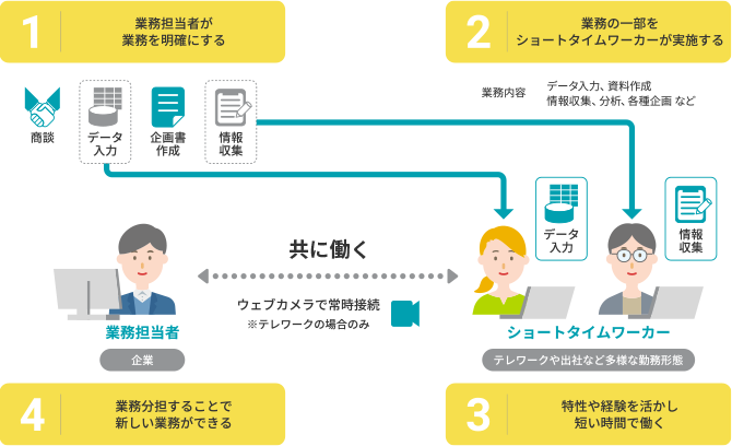 1 業務担当者が業務を明確にする 2 業務の一部をショートタイムワーカーが実施する 3 特性や経験を活かし短い時間で働く 4 業務分担することで新しい業務ができる 1 業務担当者が業務を明確にする 2 業務の一部をショートタイムワーカーが実施する 3 特性や経験を活かし短い時間で働く 4 業務分担することで新しい業務ができる
