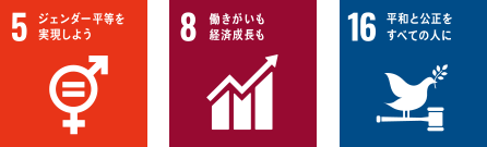 5 ジェンダー平等を実現しよう 8 働きがいも経済成長も 16 平和と公正をすべての人に 5 ジェンダー平等を実現しよう 8 働きがいも経済成長も 16 平和と公正をすべての人に