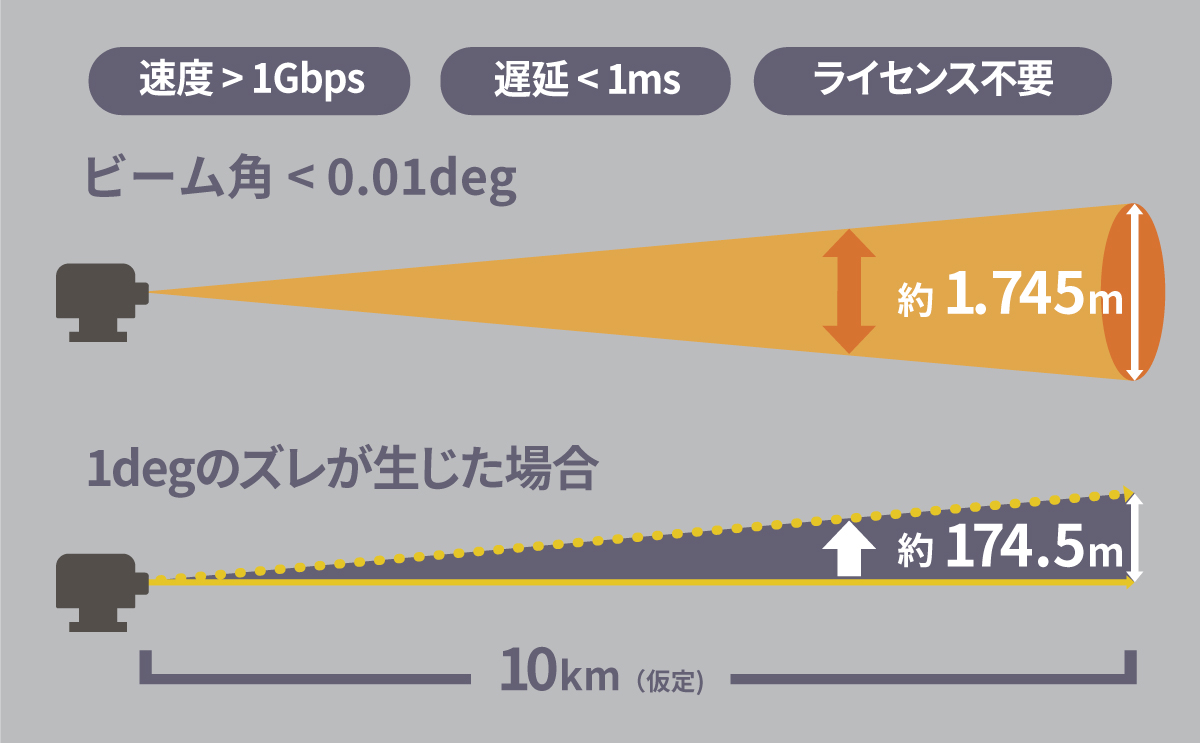 さらに、レーザー安全基準を満たせば利用ライセンスが不要であり、電気通信用の電波と比べ、通信機器の設置・運用の自由度が増すことは事業者にとっても利点になります。