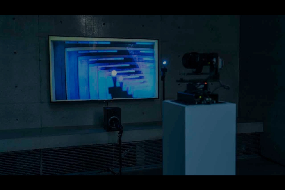 本作では、超低遅延かつ大容量である光無線通信を用いて、光の美術館と長坂コミュニティ・ステーションの2拠点間を繋ぎ、双方向の8K高精細映像と音のリアルタイム伝送を実現しています。両会場の設備構成は以下になります。光の美術館に設置したカメラでモニターを撮影し、光無線通信で伝送、そして長坂コミュニティ・ステーションに設置したモニターに映します。同様に長坂コミュニティ・ステーションに設置したカメラでモニターを撮影し、光の美術館に設置したモニターに映します。これらを超低遅延に繰り返すことで、合わせ鏡のような状態を作りだします。音も同様に、光の美術館で発生させた音をマイクで収音し、長坂コミュニティ・ステーションのスピーカーで出力、その音を同会場のマイクで収音し、光の美術館のスピーカーから出力します。これらを超低遅延に繰り返すことで、音が2つの空間を伝って反響する状態を作りだします。これらは超低遅延な光無線通信だからこそ可能な、2つの空間をまるで一つの空間の如く創り上げた作品になります。