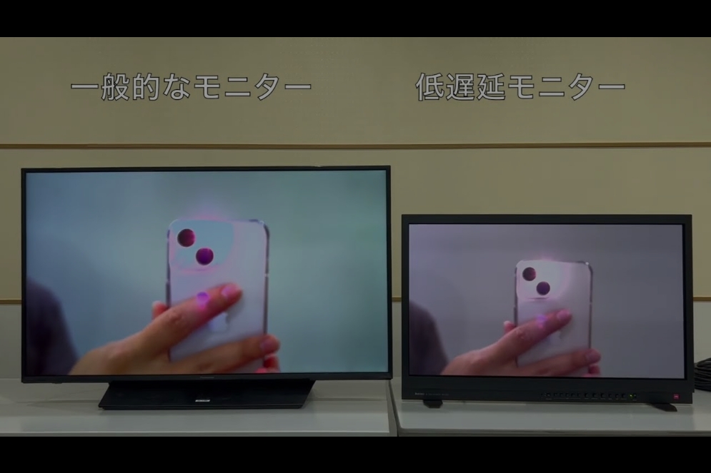 モニター出力部分のさらなる遅延削減のため、低遅延モニターを用いた簡易的な検証を実施しました。以下は、一つのカメラで撮影した映像を、一般的なモニターと低遅延モニターに同時に出力したときの動画です。カメラは作品と同じ機種で、一般的なモニターへは、作品と同様に、SDIケーブル、SDI-HDMI変換器、HDMIケーブルを介して接続しています。低遅延モニターはSDI規格に対応しているため、カメラとモニターをSDIケーブルで直接接続しています。動画から明らかなように、後者の方が前者に比べて低遅延で映像を表示できていることが確認できます。これは、低遅延モニターの方が描画処理性能が高く、構成にもSDI-HDMIの変換処理が介在しないためです。