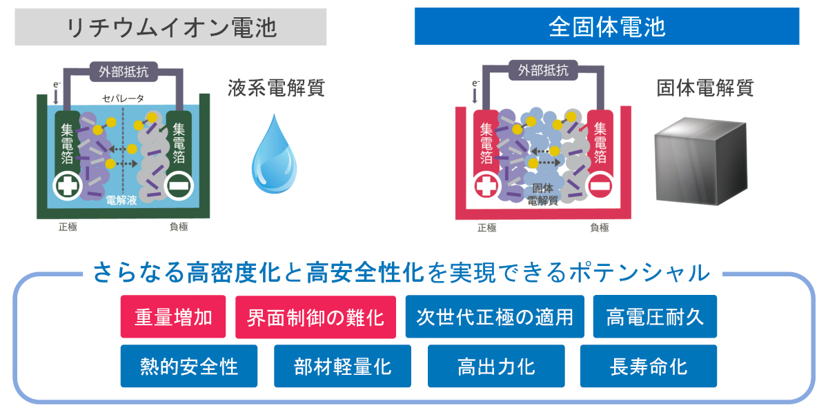 固体電解質は熱や電位に対して安定であるため、電池の温度上昇による電解液の発火・破裂の抑制や高電圧の正極活物質を使用することができ、安全性の高く、高エネルギー密度の電池を実現できると期待されています。