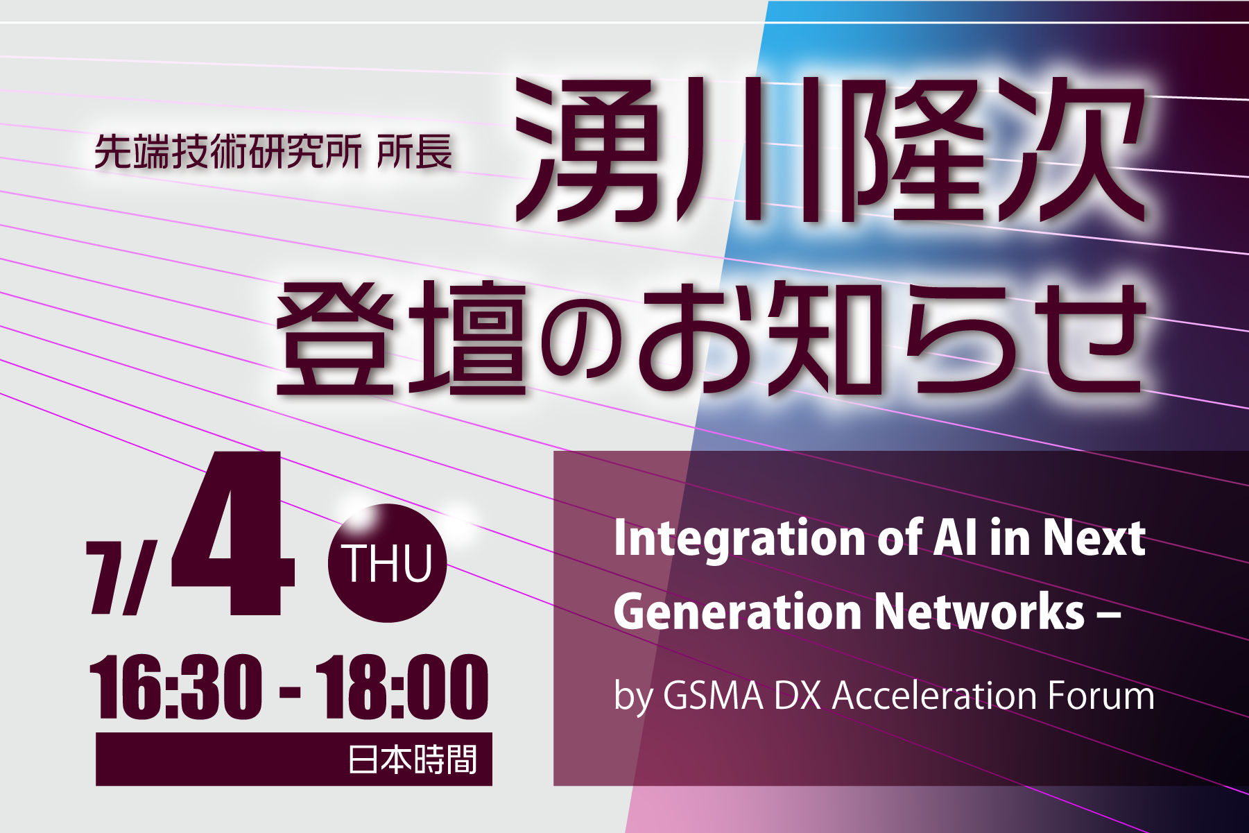 先端技術研究所 所長 湧川隆次が、7月4日にオンラインにて開催される、「GSMA DX Acceleration Forum」内のバーチャルセミナー「Integration of AI in Next Generation Networks 」にて、登壇いたします。