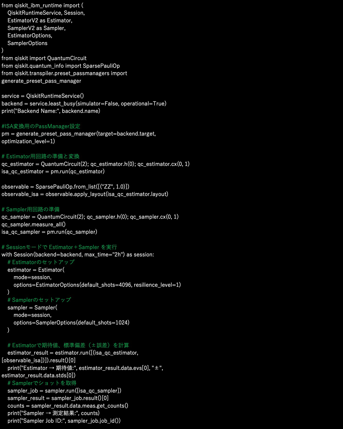 また、Sessionモードを使えば VQE や QAOA のような反復型アルゴリズムを効率よく実行できます。