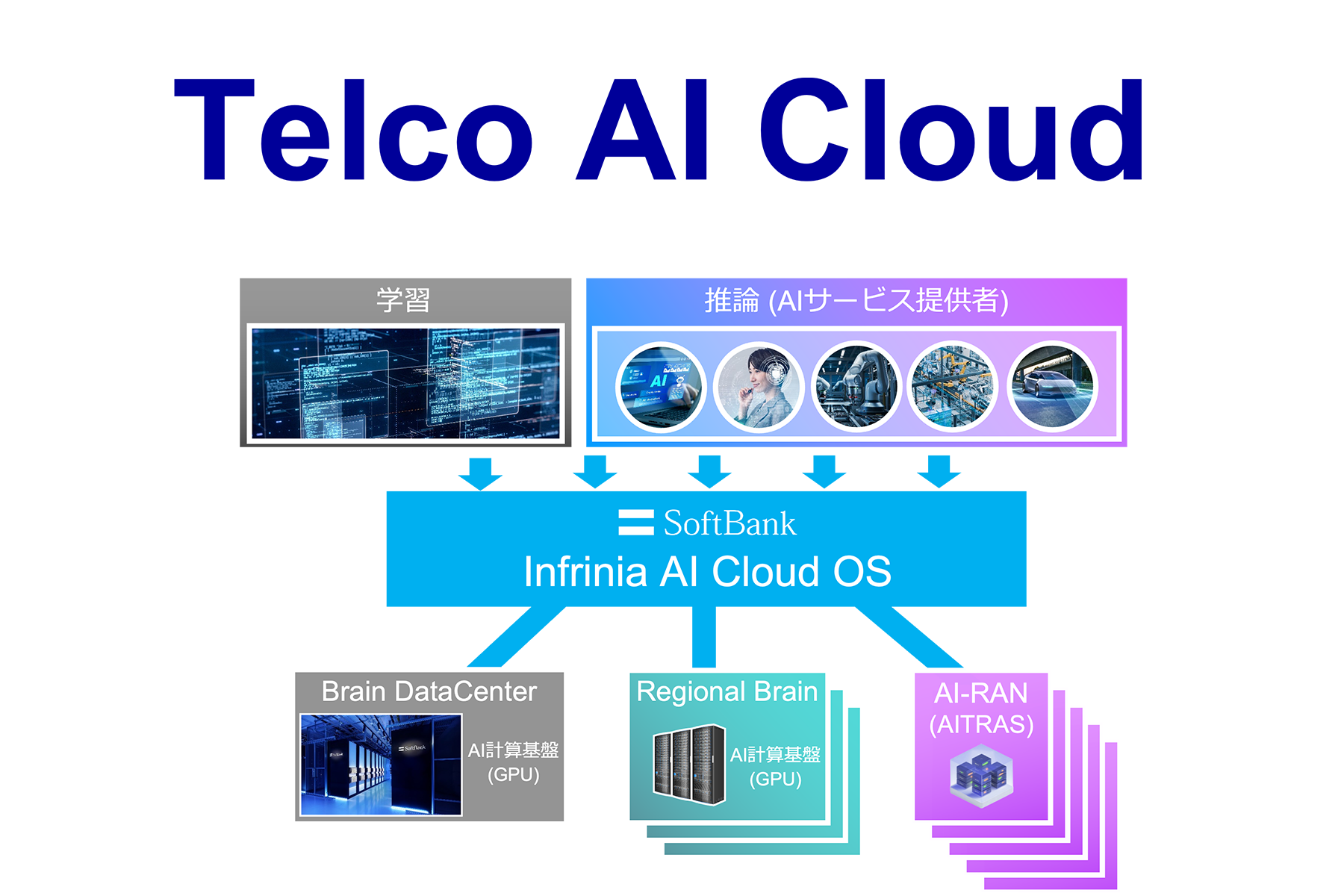 Telco AI Cloudは、GPU(Graphics Processing Unit)クラウドによる大規模なAIデータセンター基盤と、AI-RANによるMEC(Multi-access Edge Computing)基盤、AIデータセンター向けのソフトウエアスタック※1「Infrinia AI Cloud OS」を統合したAIインフラ構想です。学習から推論までのAI処理を最適化するとともに、全国規模の通信基盤を活用することで、低遅延・高信頼でソブリン性(データ主権性)を備えた分散型のAIインフラを構築します。ソフトバンクは、このTelco AI Cloud構想により、これまでの通信事業者の枠を超え、AIインフラプロバイダーへの進化を目指していきます。