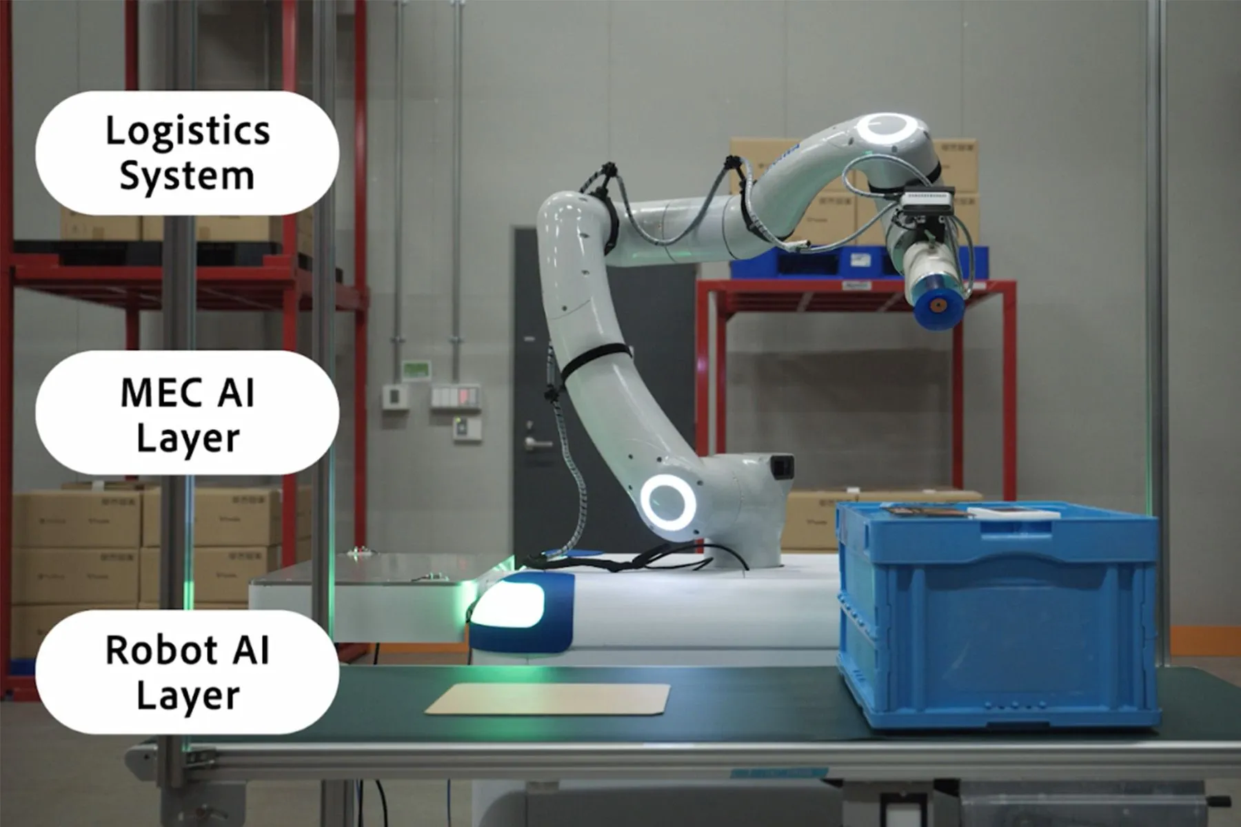 物流システムと、MEC上で動作し、ロボットへの指示内容(サブタスク)を生成するAI(MEC AI)、ロボットの具体的な動作を生成するAI(Robot AI)が連携します。
