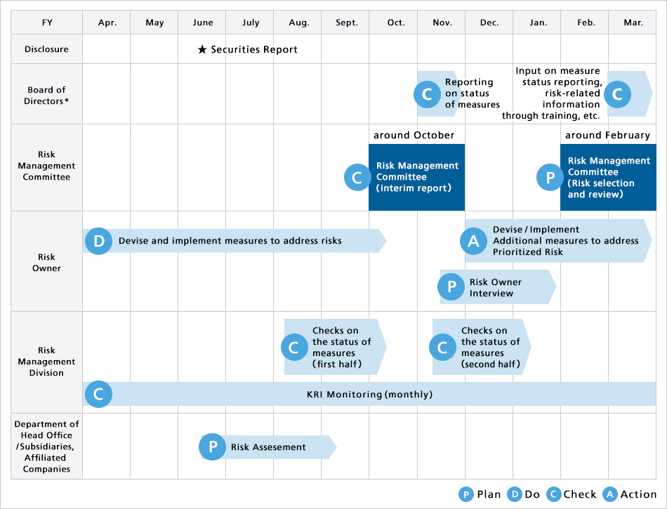 | Check | The Risk Management Division monitors the status of measures by risk owners on a monthly basis, and reports to management and the Risk Management Committee. Based on these reports, the Risk Management Committee checks the implementation status, etc. of measures, reviews risks, and checks the necessity, etc. of additional measures. |