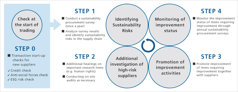 We conduct an annual sustainability procurement survey of our significant suppliers in order to identify potential “sustainability risks” in our supply chain and take appropriate measures. We believe that in order for suppliers to achieve better ESG performance, it is important to understand examples of other companies, therefore we evaluate survey results and provide feedback, including comparisons with other companies.