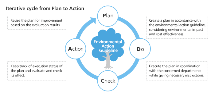 - Establish an Environment Committee under the oversight of the Executive Officer in Charge of ESG to establish an environmental management system, set environmental targets for reduction of greenhouse gas emissions, energy saving, resource saving, waste reduction, and water use reduction, and to continue to improve our environmental performance to solve issues such as climate change countermeasures and resource depletion.