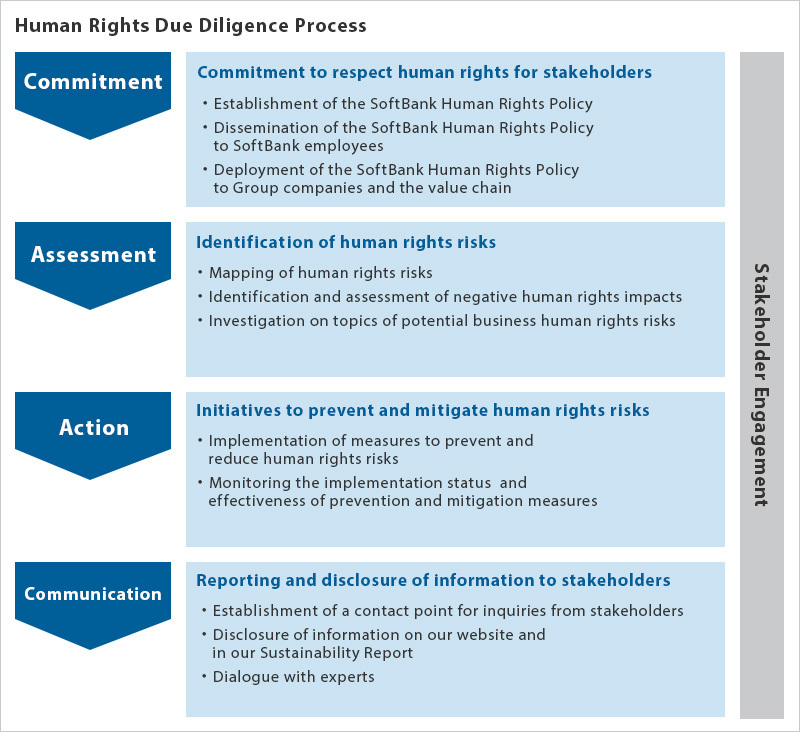 Under the concept of the “SoftBank Human Rights Policy” approved by the Board of Directors, SoftBank's human rights promotion activities are centered on the “Human Rights Committee,” which is chaired by the President and Representative Director, and whose members include executives responsible for Consumer Business, Corporate Business, Technology Unit, IT, Finance, and Corporate Affairs.