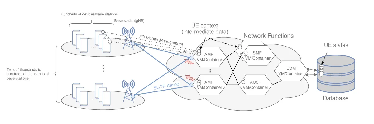 One of the challenges in these stateful synchronized systems is their lack of scalability. For example, the Access and Mobility Management Function (AMF), which is responsible for the connection between the base station and the core network, is constantly connected to a communication protocol called Stream Control Transmission Protocol (SCTP)※2 . If a failure occurs to the AMF for any reason, it will need to establish connections between the large number of base stations and the redundant AMF, and then rebuild the access information from the large number of devices from scratch. In addition, states have to be synchronously held between NFs that have been defined for each function. This entails the sending and receiving of a large volume of states between NFs. Due to this architecture, once a major failure has occurred, an extremely long amount of time is required to resolve it, and in some cases, it cannot be resolved regardless of the time spent on it.