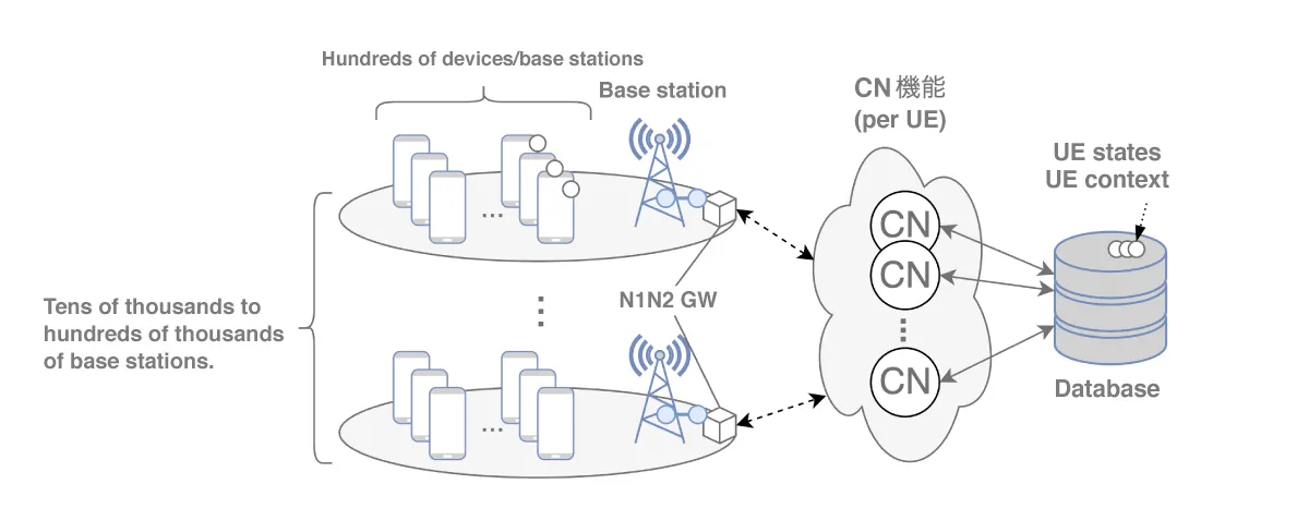 Due to this, the Research Institute of Advanced Technology has been conducting R&D with the idea that if in a mobile network, a core network can be launched in a stateless mode for each request from devices, like on large-scale EC websites, we can achieve the creation of a robust and scalable core network.