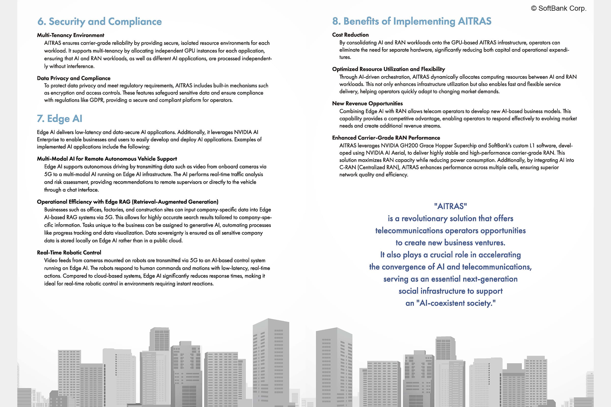 SoftBank has initiated full-scale development of an integrated solution "AITRAS," enabling AI and RAN (Radio Access Network) to operate on the same NVIDIA accelerated computing platform. AITRAS is a high-performance, high-quality carrier-grade solution aimed at deployment in SoftBank's commercial network and with plans for domestic and international expansion starting in 2026By operating AI and RAN efficiently on the NVIDIA GH200 Grace Hopper Superchip platform, it achieves reduced power consumption and enhanced stability. Additionally, integration with virtualization infrastructure enables optimized resource allocation. Implementing AITRAS allows telecom operators to continue investing in existing RAN infrastructure while simultaneously building AI capabilities, paving the way for more efficient network operations.