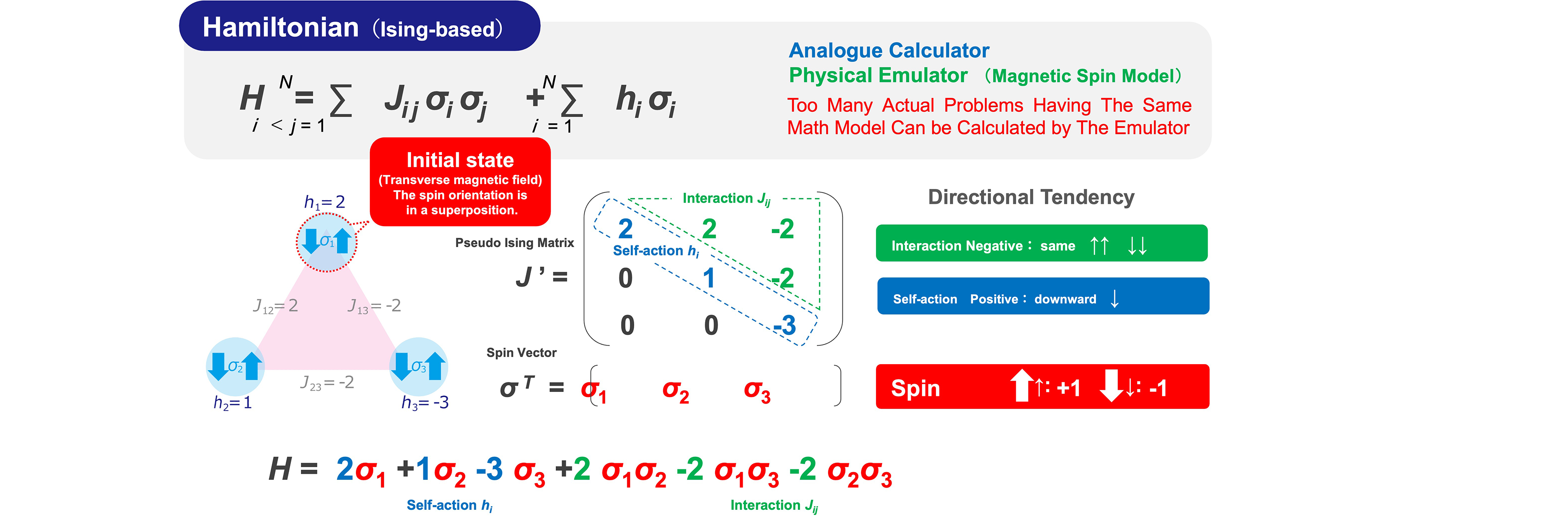 Entering this equation into a quantum annealing machine sets the self-interactions and interactions between qubits. The machine then “leaves it to nature” to perform operations that minimize energy, returning the qubit values and energy values at that point as the answer. Unlike conventional computers, programming is unnecessary; setting these interaction coefficients itself constitutes the programming.
