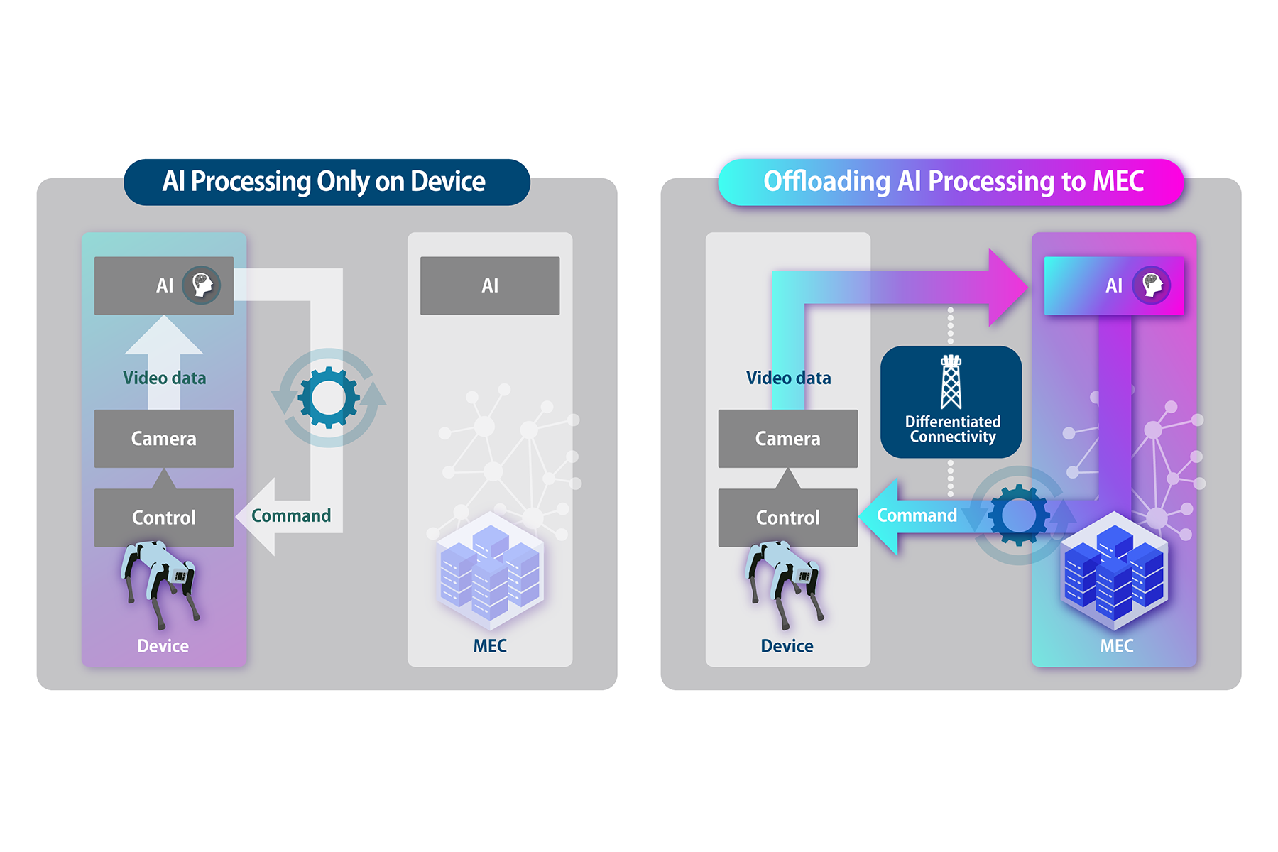 As a result, it was confirmed that, in accordance with the robot’s operational status and required processing tasks, AI processing—previously performed directly on the robot—can be dynamically offloaded to the MEC environment. Additionally, the communication network can be optimized through the implementation of differentiated connectivity*2 using Ericsson network functions, such as network slicing and priority control, enabling the realization of stable Physical AI.