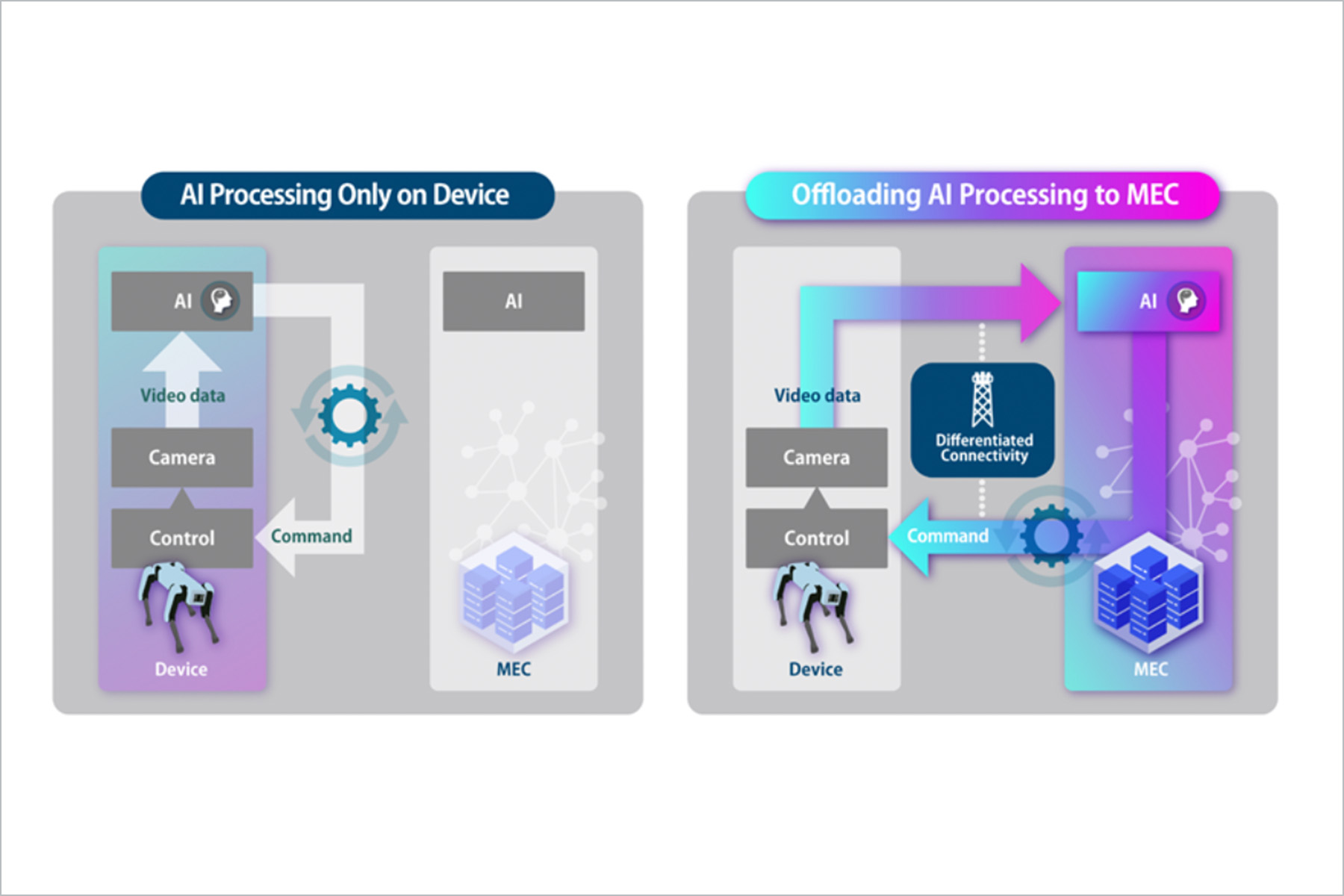 This offloading architecture enables optimal robot control by dynamically switching where AI processing is executed—either on the robot itself or on external computing resources such as an MEC platform—based on factors such as available computational resources, communication quality, latency, and task complexity.