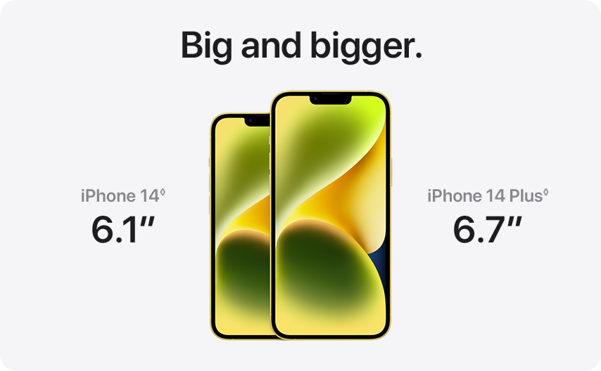 - Display: The display has rounded corners that follow a beautiful curved design, and these corners are within a standard rectangle. When measured as a standard rectangular shape, the screen is 6.06 inches (iPhone 14), 6.68 inches (iPhone 14 Plus), 6.12 inches (iPhone 14 Pro), or 6.69 inches (iPhone 14 Pro Max) diagonally. Actual viewable area is less.