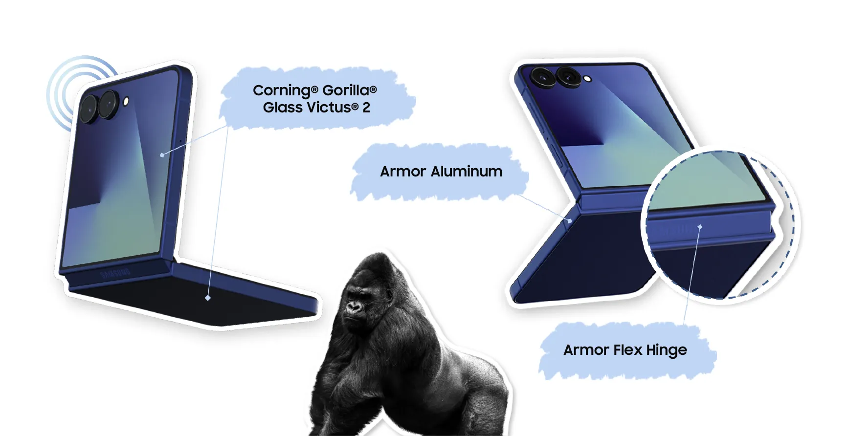 Gorilla® Glass Victus® 2, and the frame is made of Armor Aluminum.