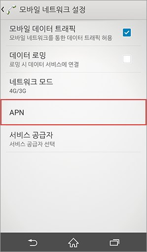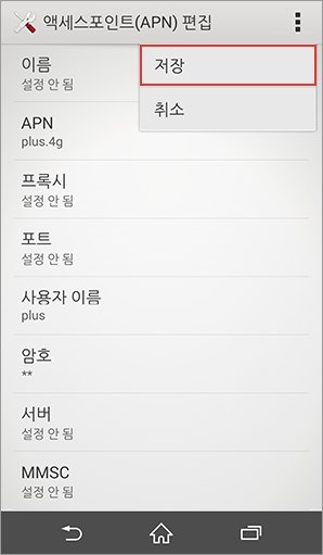 메뉴에서 「저장」을 눌르고 APN 목록에서 설정한 APN을 선택합니다.