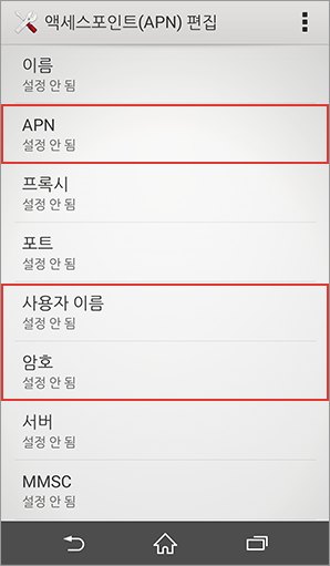 「APN」→ 액션 바의 「+」를 눌러 아래에 기재되어 있는 「APN」, 「사용자 이름」, 「암호」를 설정합니다.