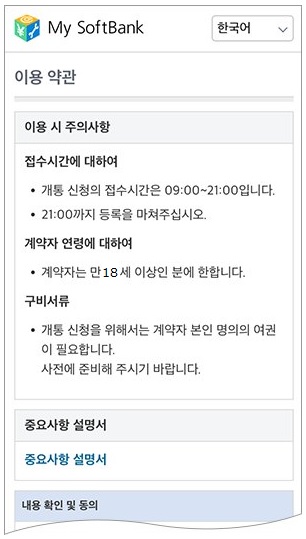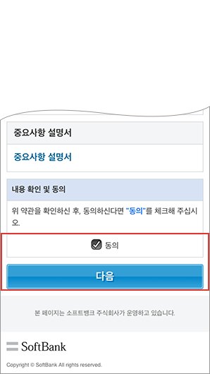 「이용 시 주의사항」과 「중요사항 설명서」의 내용을 확인하시고 「동의」에 체크를 하신 후 「다음」을 눌러 주십시오.