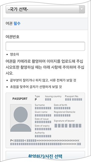 - 이용 신청에는 카메라 기능이 있는 휴대폰으로 여권 원본의 촬영 및 업로드가 필요합니다.