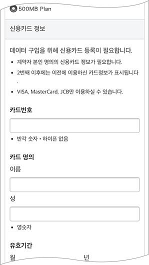 2025년 2월 18일(화)을 기점으로 "500MB 요금제"(추가 요금제 구매)의 신청 접수를 종료하게 됩니다. 이용을 원하시는 경우 새로이 "Prepaid SIM for Travel"을 계약하셔야 합니다.