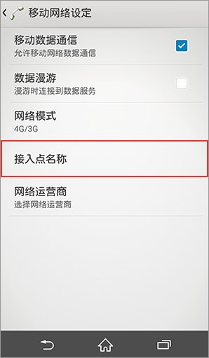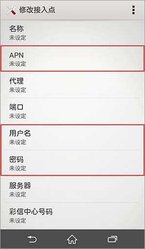 点击“接入点名称” → 操作杆的“+”,设置“APN”,“用户名”,“密码”。