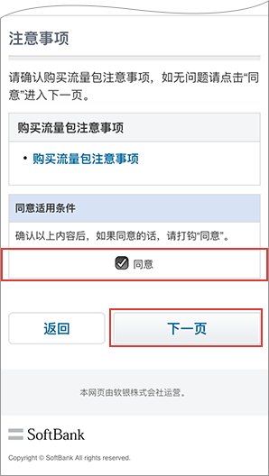 请确认“购买套餐注意事项”的内容后,打钩“同意”,点击“下一页”。