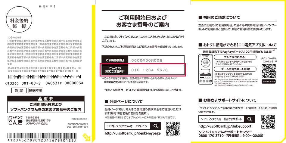 ハガキ中面の「でんきのお客さま番号」でご確認いただけます。