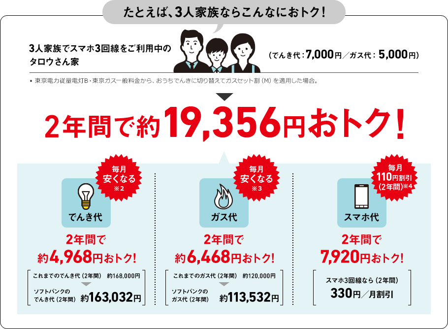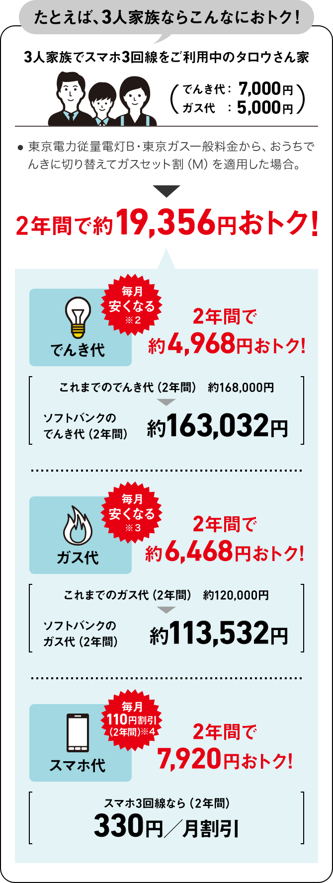 - ※2おうちでんきにご加入の場合、ご契約中のおうち割 でんきセット対象のスマートフォン・タブレット・固定通信サービスなど1回線ごとに110円/月割引(2年間)が適用となります。3年目以降は55円/月割引です。なお、割引の適用回線数はソフ トバンクは「おうち割 でんきセット(M)」にてスマートフォン・タブレット・固定通信サービス・モバイルWi-Fiルーターより最大で10回線。ワイモバイルは固定通信サービスに関しては、「おうち割 でんきセット(M)」にて10回線と、スマートフォン・タブレット・モバイルWi-Fi ルーターに関しては「おうち割 でんきセット(A)」にて10回線の合計最大20回線まで適用されます。〇おうちでんき ガスセット割を解約する際は、解約事務手数料550円および契約解除料5,000円がかかります。なお、当面の間、請求しません(2023年3月6日現在)。〇SBパワーがでんきを供給します。ガスのご契約プランは、東京電力エナジーパートナー(株)の「ソフトバンクガス Powered by TEPCO」に切り替わります。一部対象外エリアがあります。お申し込みいただいても、本サービスをご提供できない場合があります。〇記載の金額は税込です。
