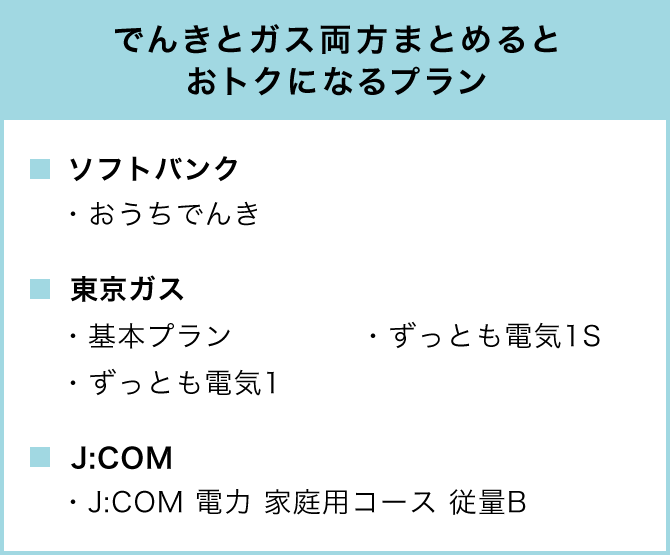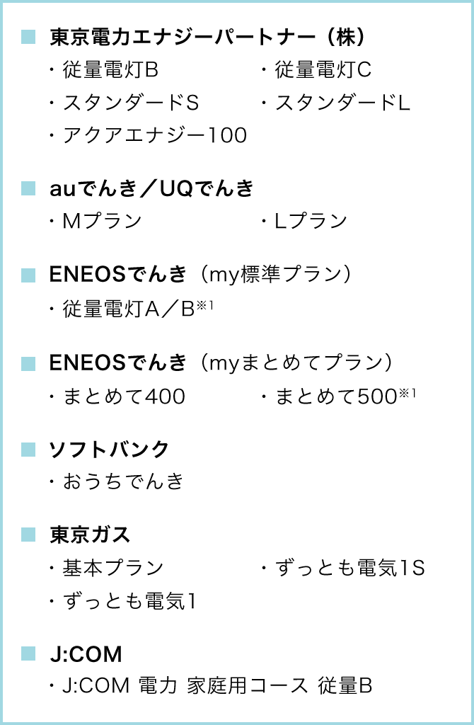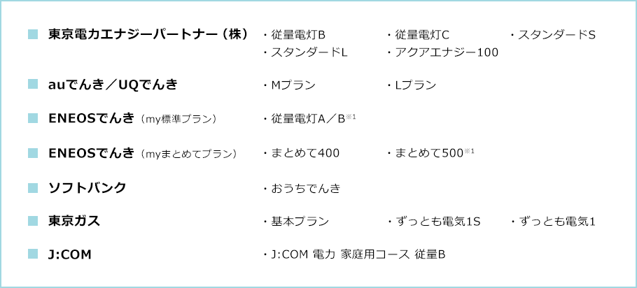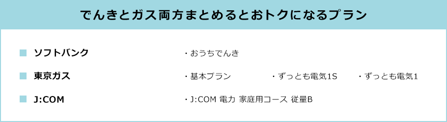 - 東京ガス:暖らんプラン、エコウィルで発電エコプラン、エネファームで発電エコプラン、湯ったりエコプランなど。