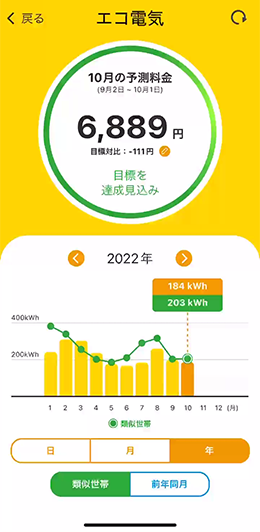 日々の使用状況をもとに独自のAI技術により算出している1ヵ月分の電気代の予測料金を確認することができます。