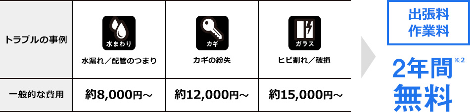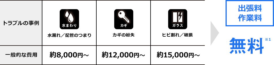 水まわり、カギ、ガラスのトラブルに出張料・作業料無料で駆けつけ、応急処置の対応をいたします。