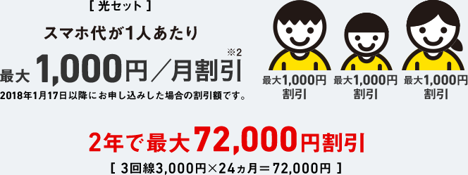 • 割引の上限回線数は、「おうち割 でんきセット(M)」にて固定通信サービス/スマートフォン/ケータイ/タブレット/モバイルWi-Fiルーターより最大10回線。ソフトバンク指定の携帯電話、通信機器、固定通信サービスまたは料金プランの契約が必要です。詳細について、「おうち割 でんきセット」はこちら